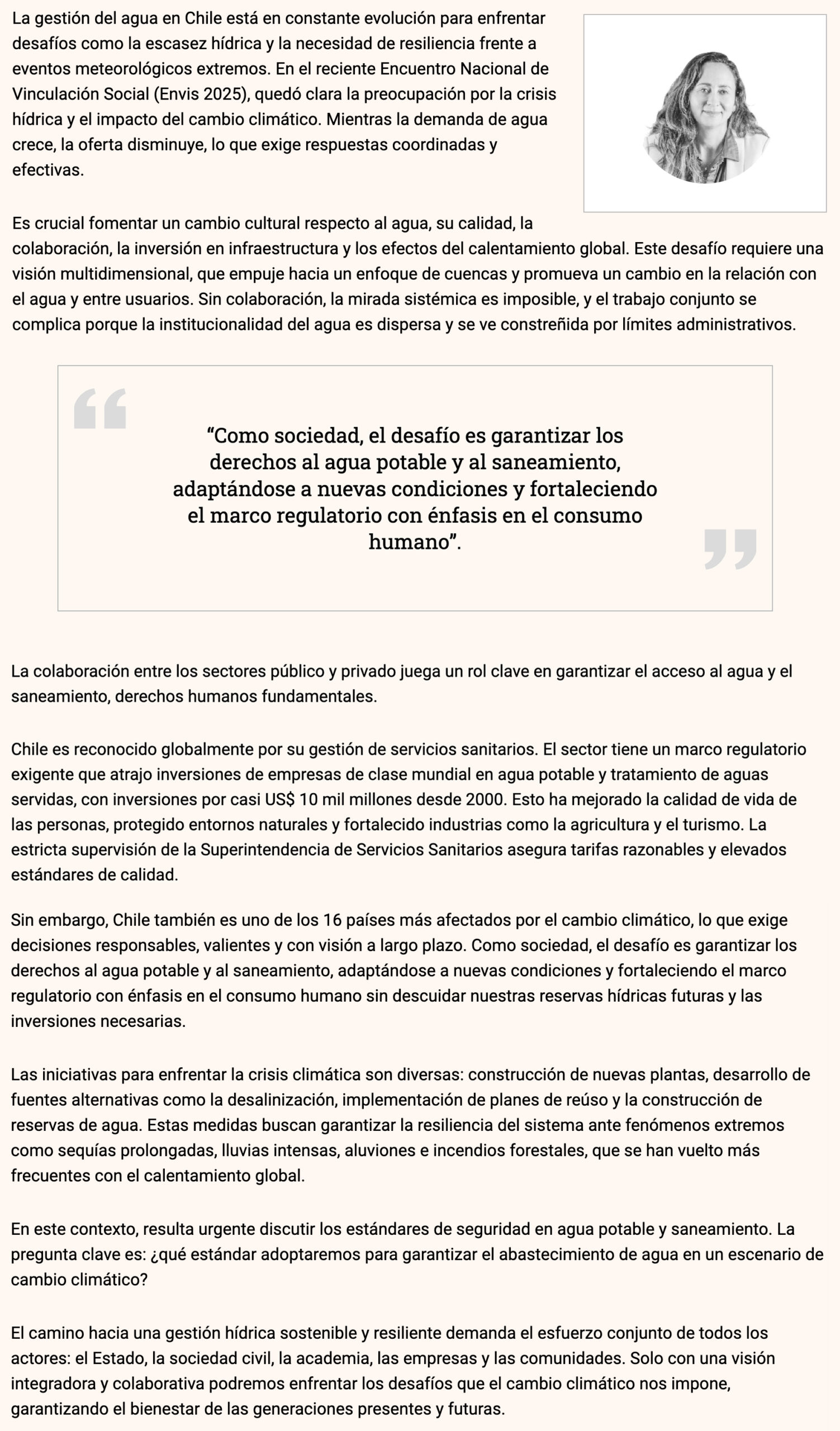 DIARIO FINANCIERO – Como sociedad, el desafío es garantizar los derechos al agua potable y al saneamiento, adaptándose a nuevas condiciones y fortaleciendo el marco regulatorio con énfasis en el consumo humano.