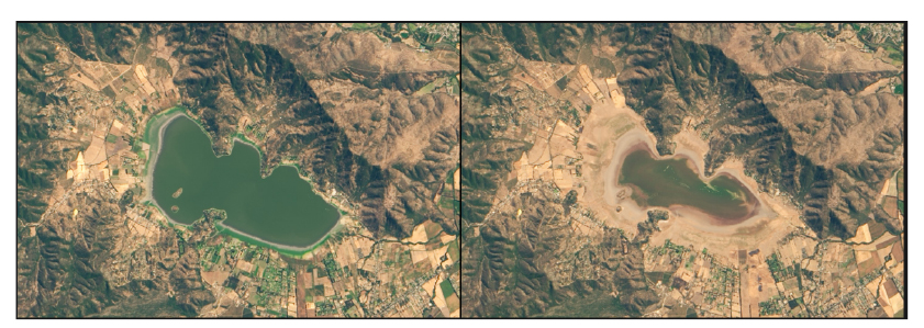 Estas imágenes contrastan una foto del lago en 2014, cuando aún contenía una cantidad considerable de agua, y en 2019, cuando solo presentaba barro y vegetación. El declive del lago se debe a la inusual sequía de la última década, unida al creciente consumo de agua por parte de la creciente población.