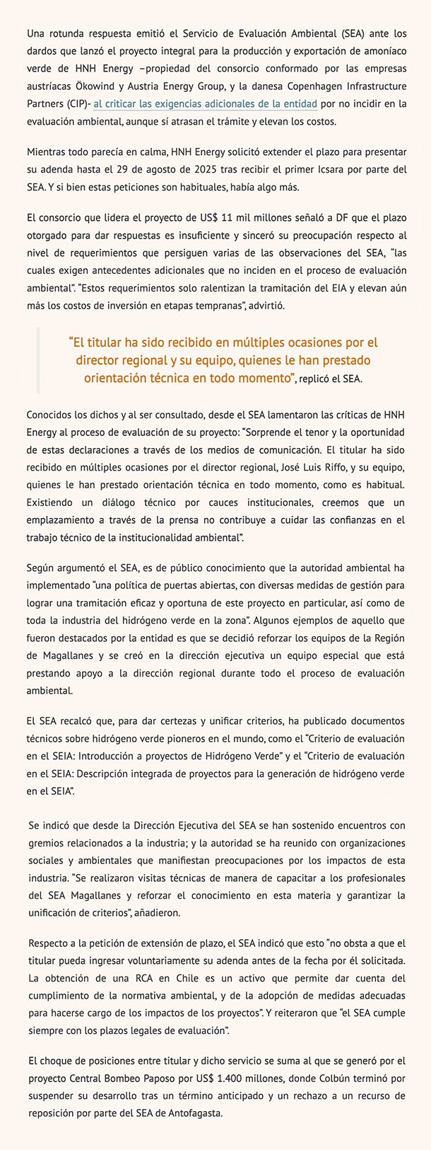 DIARIO FINANCIERO – El Servicio lamentó dichos de HNH Energy que criticó, tras recibir su primer Icsara, exigencias adicionales de la entidad, alertando que ralentizan trámite y elevan costos.