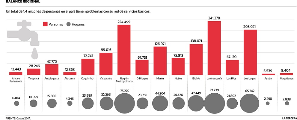 La situación de esa comuna se extiende a lo largo del país: de acuerdo a la encuesta Casen de 2017, existen 1.431.162 personas pertenecientes a 478.308 hogares, que no poseen servicios básicos como agua potable, red del alcantarillado o bien declaran no tener una llave dentro de su vivienda (ver infografía). Ese extenso grupo fue definido por el Presidente Sebastián Piñera como población “vulnerable”, y encargó al Ministerio de Obras Públicas (con la colaboración del sector privado) hallar soluciones urgentes.