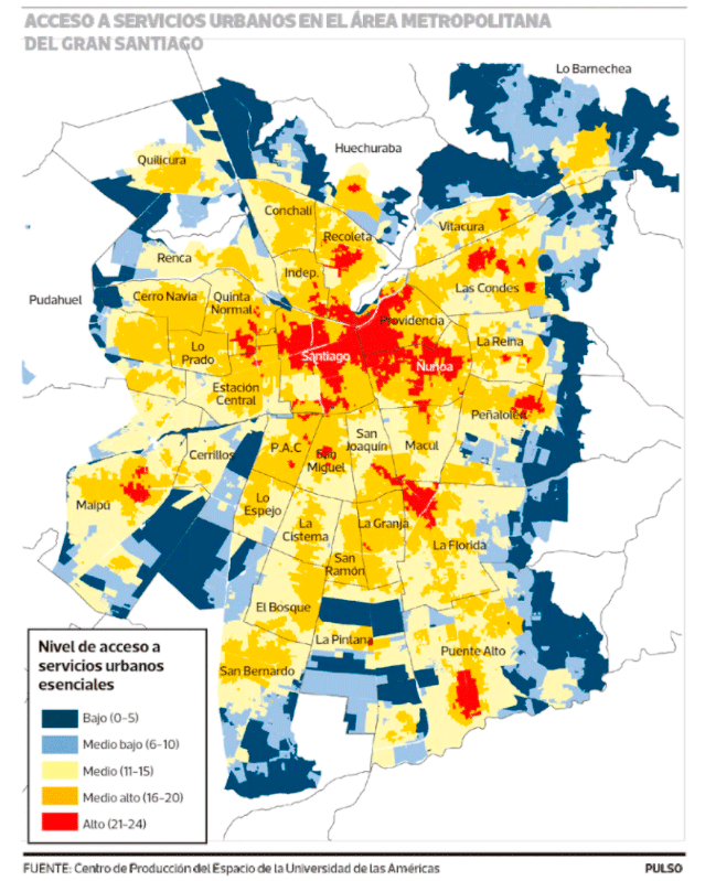 Uno de los autores del estudio, el geógrafo Juan Correa, sostiene que “para servicios locales, componente principal de este análisis, gran parte de las variables corresponden a funciones que en la ciudad de Santiago son responsabilidad de agentes privados, donde la toma de decisiones se basa en la ley de la oferta y la demanda, en lugar de un sistema de planificación integrado”.