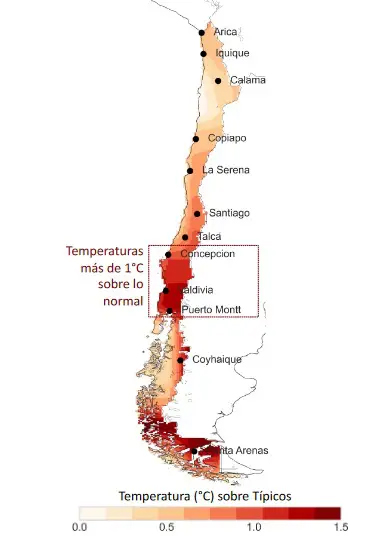 ¿Y la zona norte? Aunque las anomalías de temperatura fueron menos agudas que en el resto del país, en el norte del país la temperatura estuvo también significativamente alta, “alrededor de 0,5°C sobre valores típicos”, indica Cordero.