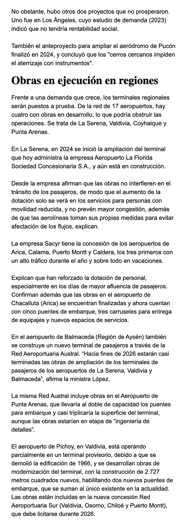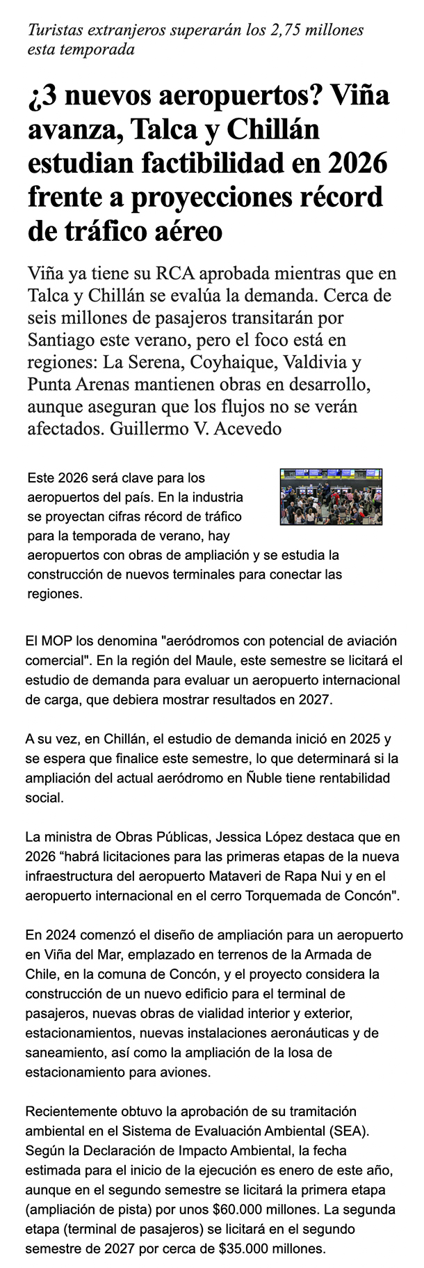 EL MERCURIO – Viña ya tiene su RCA aprobada mientras que en Talca y Chillán se evalúa la demanda. Cerca de seis millones de pasajeros transitarán por Santiago este verano, pero el foco está en regiones.