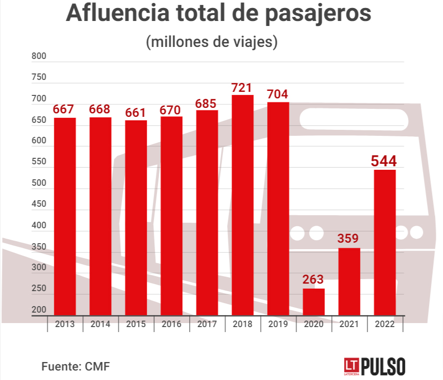 Ese 2018 fue el peak. En 2019 los viajes descendieron levemente por el estallido social iniciado en octubre de 2019, lo que afectó la disponibilidad de la red; en 2020 cayó a su mínimo histórico por la pandemia y las cuarentenas, en 2021 se recuperó parcialmente y en 2022 ya hubo un año de relativa normalidad. Pero la cifra sigue estando bajo el peak y el año 2019, previo a la pandemia.