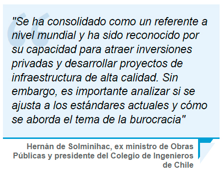 Al ser consultado por el tema, el ex ministro de Obras Públicas durante el primer mandato de Sebastián Piñera y presidente del Colegio de Ingenieros de Chile, Hernán de Solminihac, destacó que “a través de la modalidad de asociación público-privada, se ha logrado atraer inversiones privadas significativas que de otra manera serían difíciles de conseguir. Esto ha permitido la construcción y modernización anticipada de carreteras, aeropuertos, puertos, hospitales y otros proyectos de infraestructura necesarios para el desarrollo económico y social de Chile”.