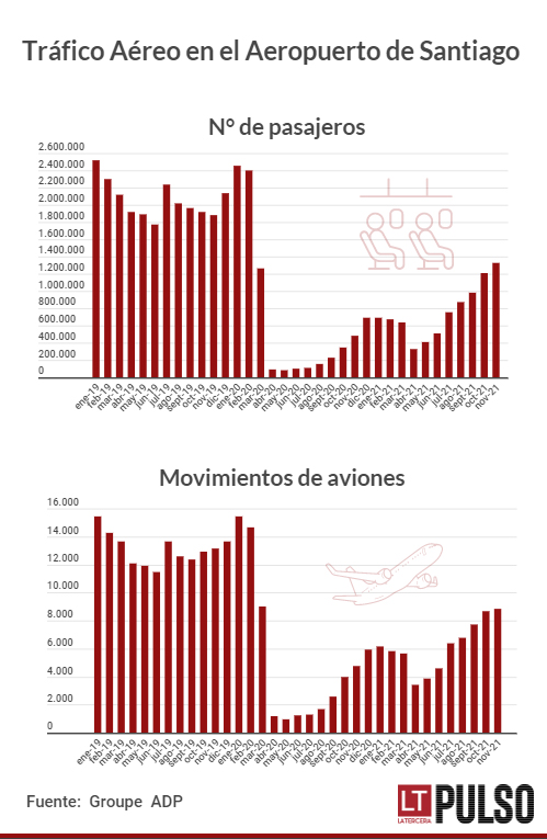 Eso hasta noviembre, cuando finalmente se pasó a terreno positivo con una variación interanual de 8,8%, gracias al tránsito de 8.516.320 de personas por el terminal aéreo capitalino, las que se comparan con las 7.827.500 acumuladas al mismo mes de 2020.
