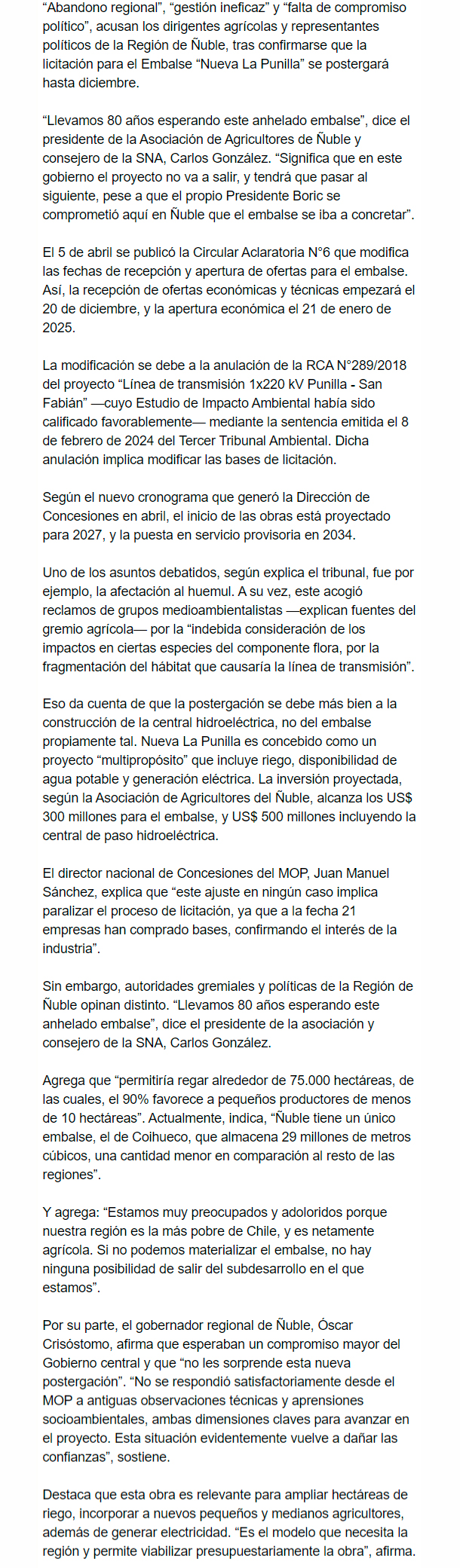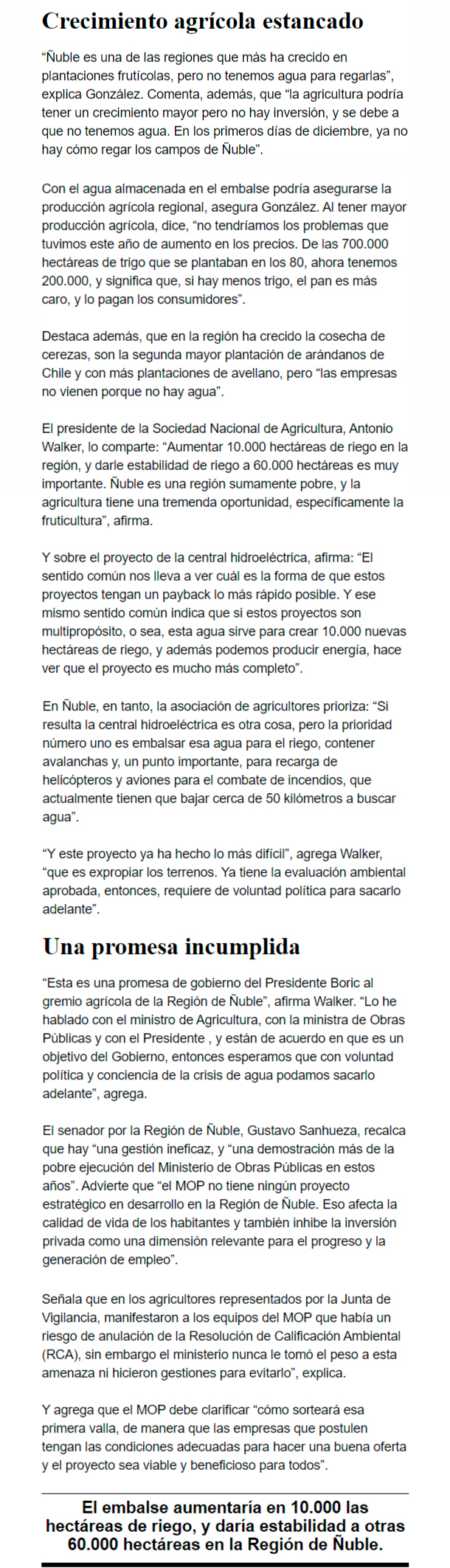 EL MERCURIO – En el nuevo cronograma, el inicio de obras está proyectado para 2027. El embalse aumentaría en 10.000 las hectáreas de riego, y daría estabilidad a otras 60.000 hectáreas
