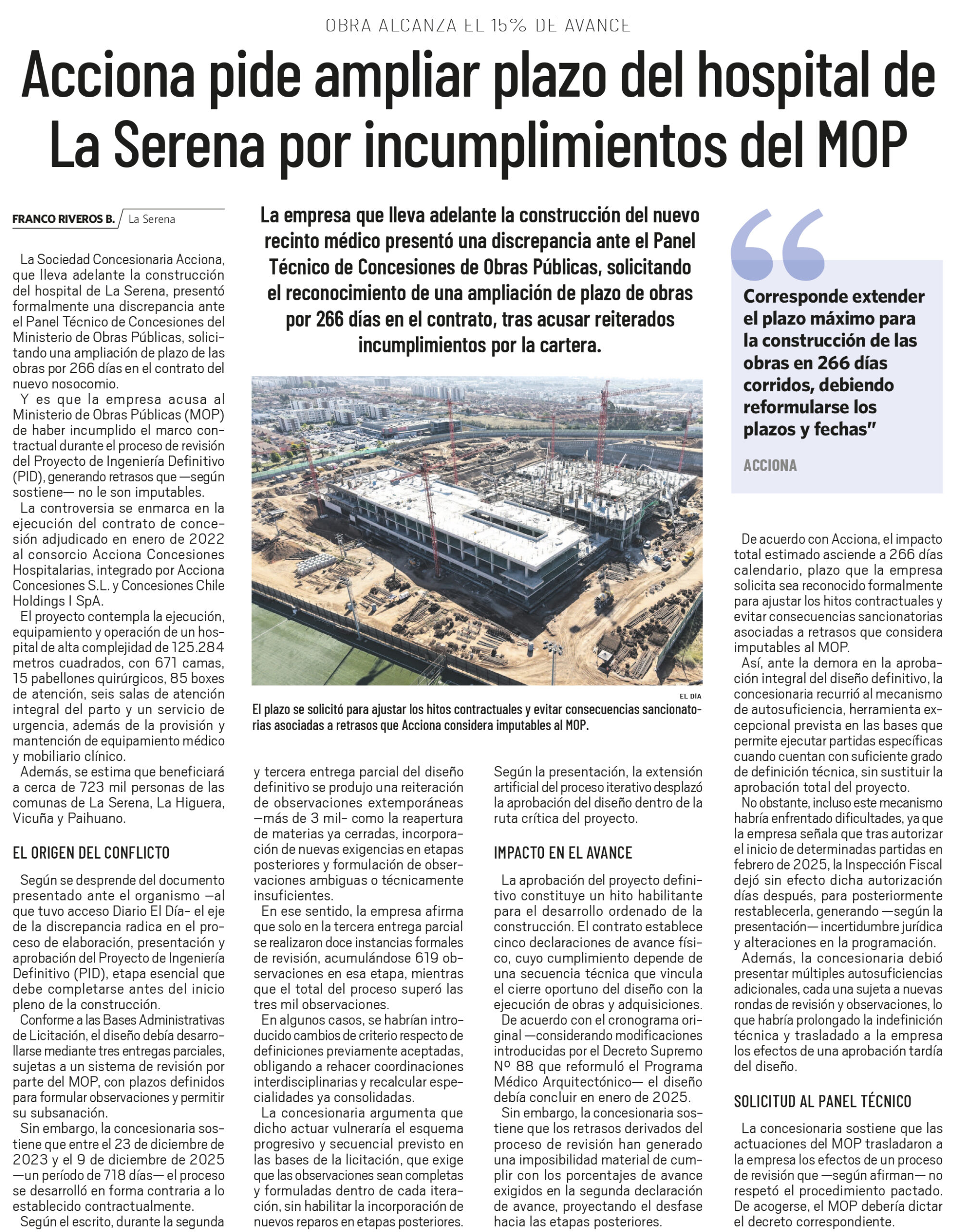 EL DÍA – La empresa que lleva adelante la construcción del nuevo recinto médico presentó una discrepancia ante el Panel Técnico de Concesiones de Obras Públicas, solicitando el reconocimiento de una ampliación de plazo de obras por 266 días en el contrato, tras acusar reiterados incumplimientos por la cartera.