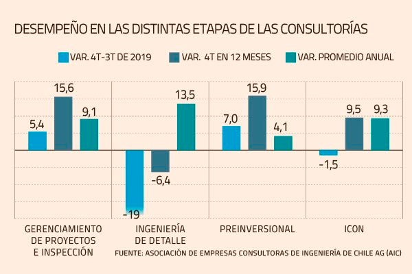 Si bien el índice de actividad que elabora la Asociación de Empresas Consultoras de Ingeniería de Chile AG (AIC) registró un crecimiento de 9,5% en el cuarto trimestre de 2019, en comparación con el mismo período del año anterior, este desempeño estuvo por debajo de lo esperado. Al igual que el 9,3% que registró en promedio al cierre de 2019.