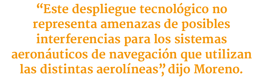 Consultado sobre el tema, Francisco Moreno, titular de la Subsecretaría de Telecomunicaciones (Subtel), aseguró que “este despliegue tecnológico no representa amenazas de posibles interferencias para los sistemas aeronáuticos de navegación que utilizan las distintas aerolíneas”.