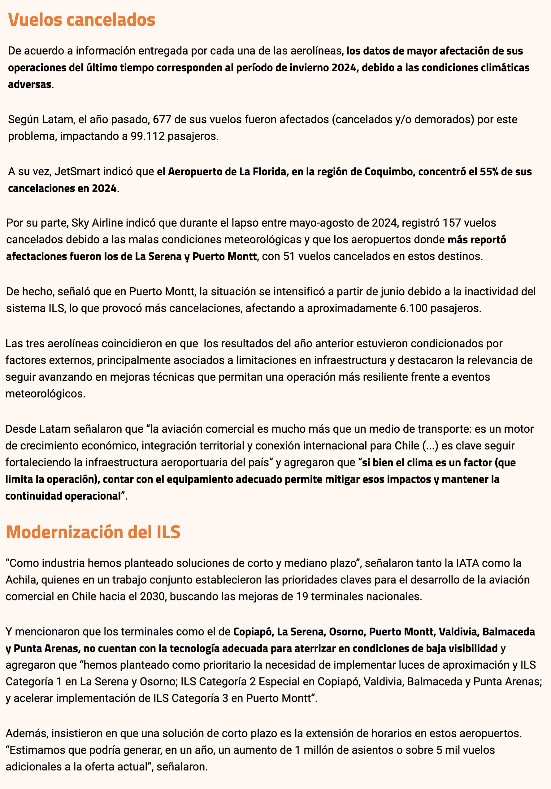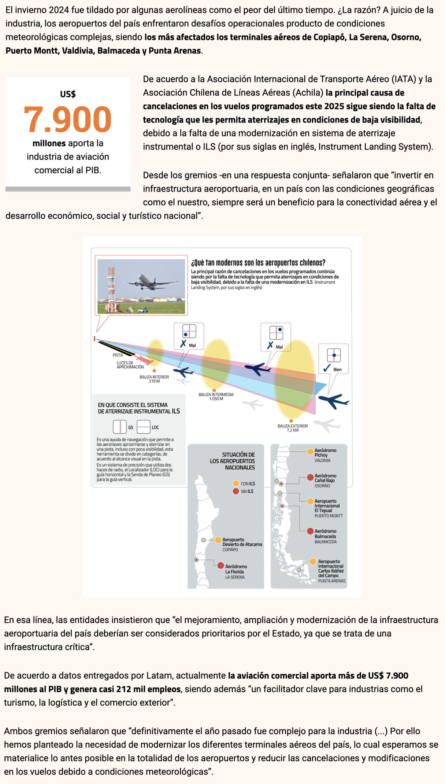 DIARIO FINANCIERO – IATA y Achila señalaron que, en específico, los terminales de Copiapó, La Serena, Osorno, Puerto Montt, Valdivia, Balmaceda y Punta Arenas, no tienen la tecnología adecuada para aterrizar con baja visibilidad.