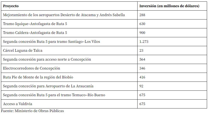 “Los aeropuertos de Antofagasta y Atacama; las nuevas inversiones para incorporar mejores estándares en la Ruta 5 en los tramos de Caldera-Antofagasta y Antofagasta-Iquique; los accesos a Valdivia, y los electrocorredores de Concepción. Hay una cartera importante de proyectos que tenemos que ir avanzando para poder hacer los llamados”, agregó.
