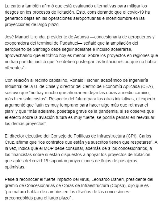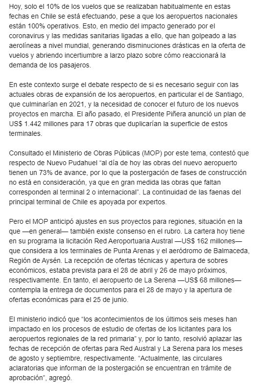 EL MERCURIO – La recepción de ofertas para las licitaciones de los terminales de Punta Arenas, Balmaceda y La Serena, que se realizaría entre abril y junio, fue postergada para agosto y septiembre. Fuente: El Mercurio, Jueves 23 de Abril 2020