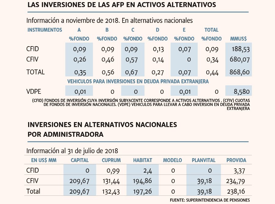De acuerdo a la nueva ley, las AFP pueden invertir hasta un 20% de los fondos en activos alternativos. Según lo fijado por el Banco Central, el tope es de 20%, 17%, 14% y 10% para los fondos A, B, C, y D, respectivamente.