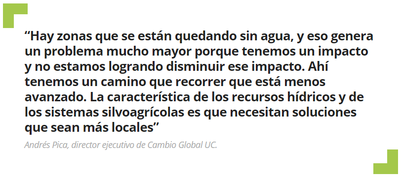 “Hay zonas que se están quedando sin agua, lagunas como Aculeo que ya se secaron, y eso genera un problema mucho mayor porque tenemos un impacto y no estamos logrando disminuir ese impacto. Ahí tenemos un camino que recorrer que está menos avanzado. La característica de los recursos hídricos y de los sistemas silvoagrícolas es que necesitan soluciones que sean más locales”, afirma Andrés Pica.