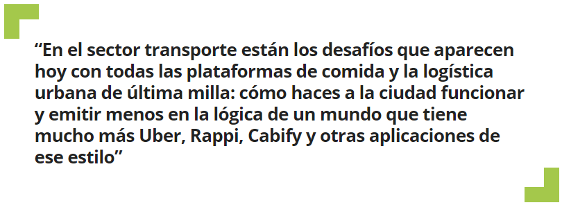 “Y por otro lado -afirma- están los desafíos que aparecen hoy con todas las plataformas de comida y la logística urbana de última milla: cómo haces a la ciudad funcionar y emitir menos en la lógica de un mundo que tiene mucho más Uber, Rappi, Cabify y otras aplicaciones de ese estilo”.