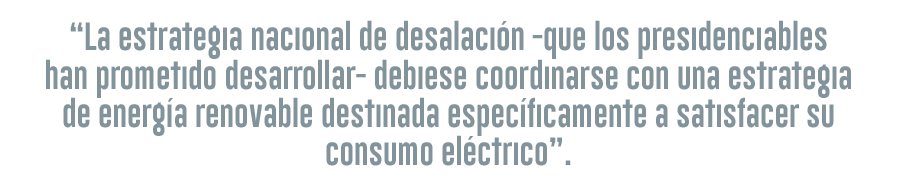 La estrategia nacional de desalación -la cual hoy consta en un proyecto de ley (boletín 11.608-09) y de la cual los presidenciables han prometido desarrollar- debiese coordinarse con una estrategia de energía renovable destinada específicamente a satisfacer su consumo eléctrico. En concreto, me refiero a que la Comisión Nacional de Energía (CNE) se coordine con la estrategia estatal de desalación y con el Ministerio de Bienes Nacionales de tal manera de abrir licitaciones públicas especialmente destinadas a satisfacer la demanda eléctrica desaladora, la cual tendría por objeto, ofrecer contratos de suministro (PPA) de mediano plazo (Ej. 10 años, renovable) que habiliten el desarrollo y construcción de proyectos solares y eólicos especialmente destinados a satisfacer estos bloques de demanda eléctrica.