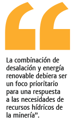 Chile tiene una oportunidad privilegiada para hacer su contribución a través de una de las tecnologías con mejor proyección para los requerimientos de agua de la minería, como es la desalación. Existen condiciones innegables para darle un mayor potencial y que su desarrollo se lleve a cabo de manera sustentable, es decir, considerando no sólo los factores económicos, sino especialmente los socio-ambientales.