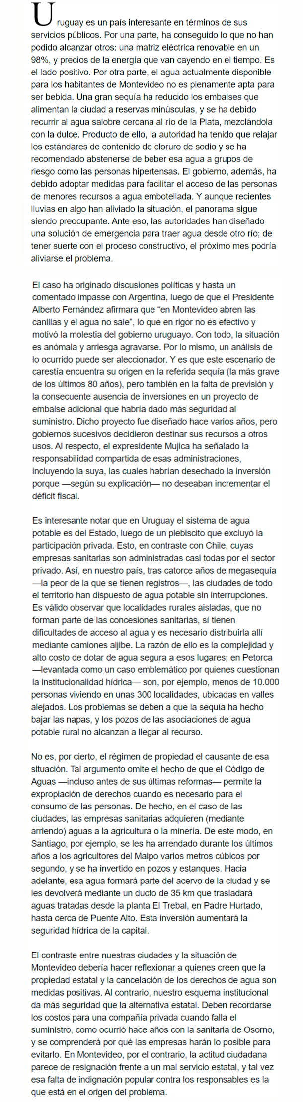 EL MERCURIO – La situación de Montevideo debería hacer reflexionar a quienes creen que la propiedad estatal es una solución.