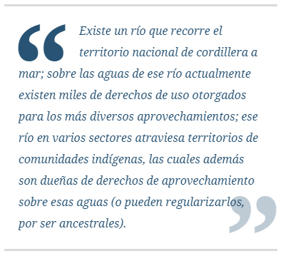 Respecto de la aplicación práctica de esta propuesta, en primer término, es útil ilustrar la situación que se da en muchas partes del país: Existe un río que recorre el territorio nacional de cordillera a mar; sobre las aguas de ese río actualmente existen miles de derechos de uso otorgados para los más diversos aprovechamientos; ese río en varios sectores atraviesa territorios de comunidades indígenas, las cuales además son dueñas de derechos de aprovechamiento sobre esas aguas (o pueden regularizarlos, por ser ancestrales).