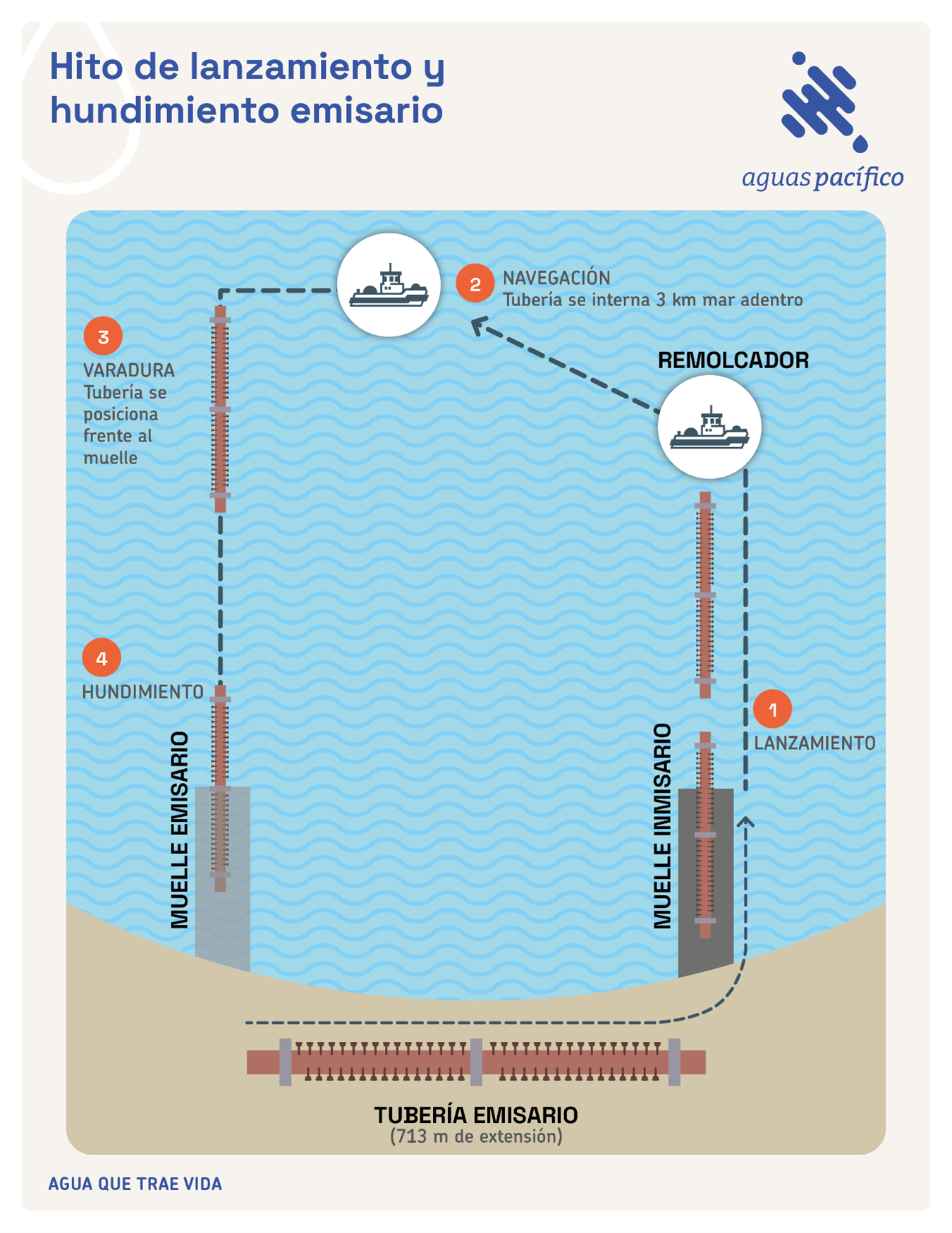 Tras un acucioso estudio técnico para verificar la existencia de las estrictas condiciones climáticas necesarias para una operación segura, a las 00:18 de este miércoles, 8 de enero, Aguas Pacífico dio inicio a extensas horas de maniobras para lanzar, posicionar y hundir los 713 metros de tubería de su “emisario”.