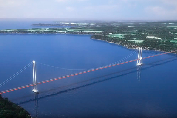 El proyecto, cuya inversión alcanza los US$ 700 millones, consiste en una estructura colgante de 2.750 metros que atravesará el canal del mismo nombre, y tiene un plazo de 5 años para concluirse. La construcción está a cargo de la coreana Hyundai.