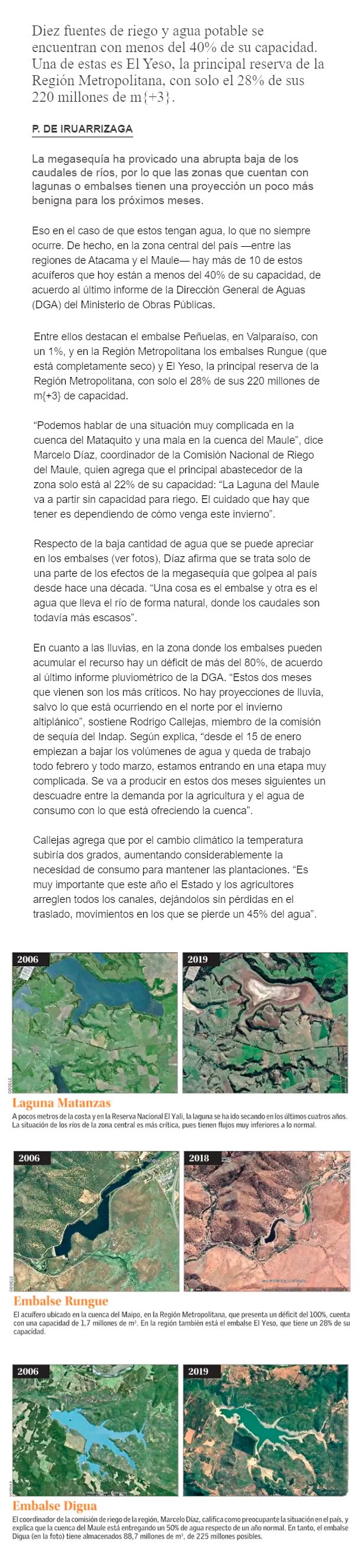 EL MERCURIO – Diez fuentes de riego y agua potable se encuentran con menos del 40% de su capacidad. Una de estas es El Yeso, la principal reserva de la Región Metropolitana, con solo el 28% de sus 220 millones de m3.