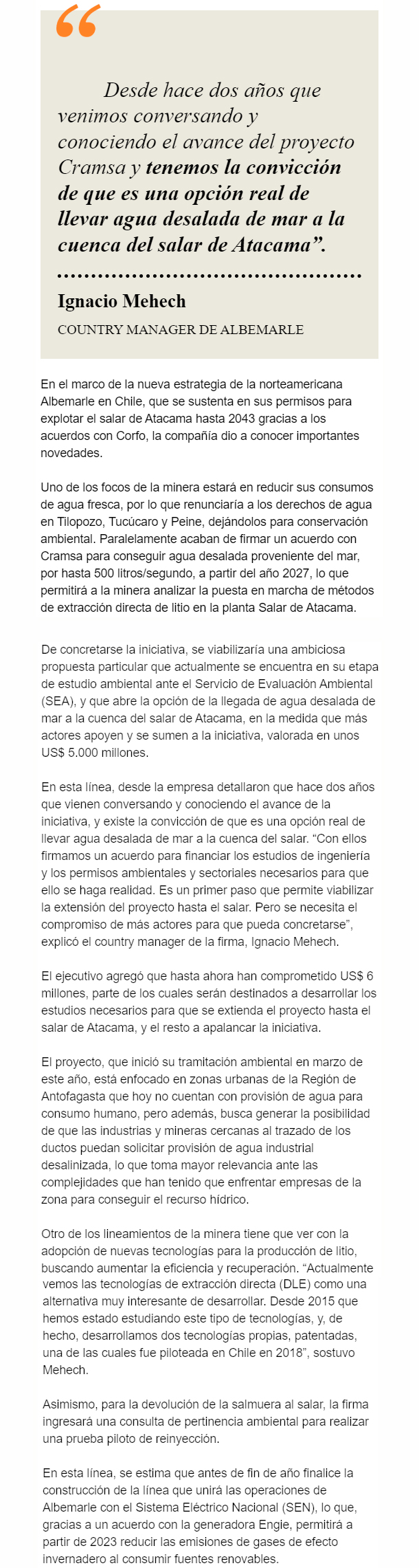 EL MERCURIO – La firma norteamericana anunció acuerdo con Cramsa, que se encuentra desarrollando una iniciativa para transportar el recurso hídrico a zonas aisladas.