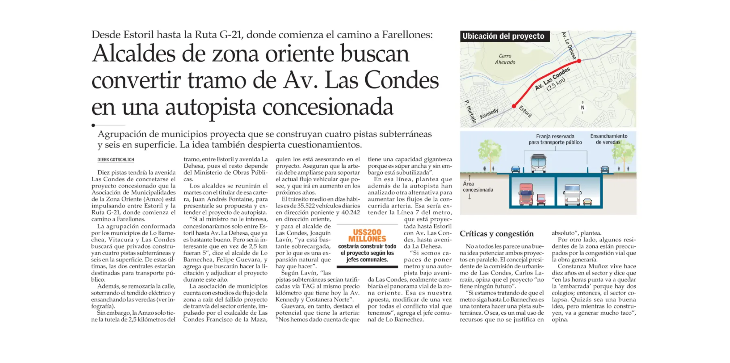 EL MERCURIO – Diez pistas tendría la avenida Las Condes de concretarse el proyecto concesionado que la Asociación de Municipalidades de la Zona Oriente (Amzo) está impulsando entre Estoril y la Ruta G-21, donde comienza el camino a Farellones.