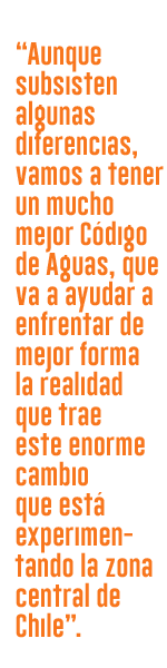Ha sido un proceso largo, pero muy fructífero, el proyecto ha mejorado muchísimo. Hay muchos acuerdos, a diferencia de lo que se ve desde afuera, que son posiciones enfrentadas. Aunque subsisten algunas diferencias, vamos a tener un mucho mejor Código de Aguas, que va a ayudar a enfrentar de mejor forma la realidad que trae este enorme cambio que está experimentando la zona central de Chile.