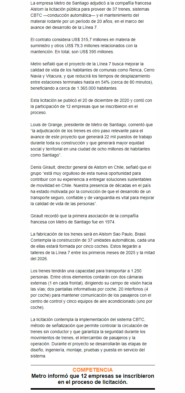 EL MERCURIO – La compañía francesa deberá fabricar 37 trenes y también encargarse del sistema de conducción automática y de la mantención del material rodante por 20 años.