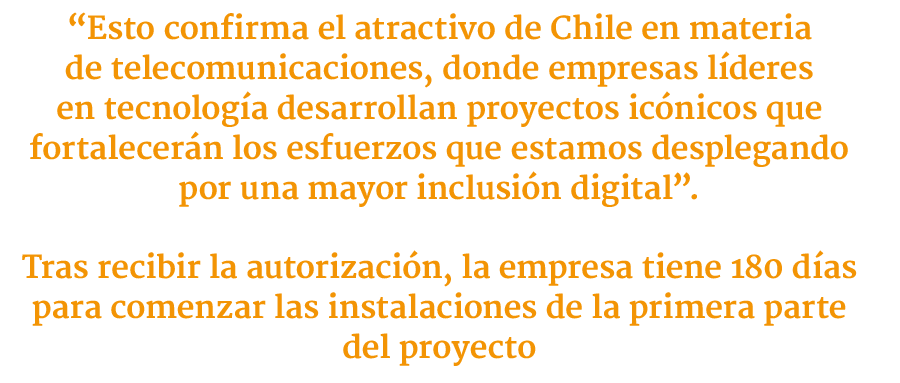 El titular de la Subtel, Francisco Moreno, explicó que esta iniciativa es parte de un portafolio de proyectos que buscan aumentar la conectividad en localidades remotas del país, utilizando diferentes tipos de tecnología. A su juicio, la inversión de ambas empresas “confirma el atractivo de Chile en materia de telecomunicaciones, donde empresas líderes en tecnología desarrollan proyectos icónicos que fortalecerán los esfuerzos que estamos desplegando por una mayor inclusión digital”.