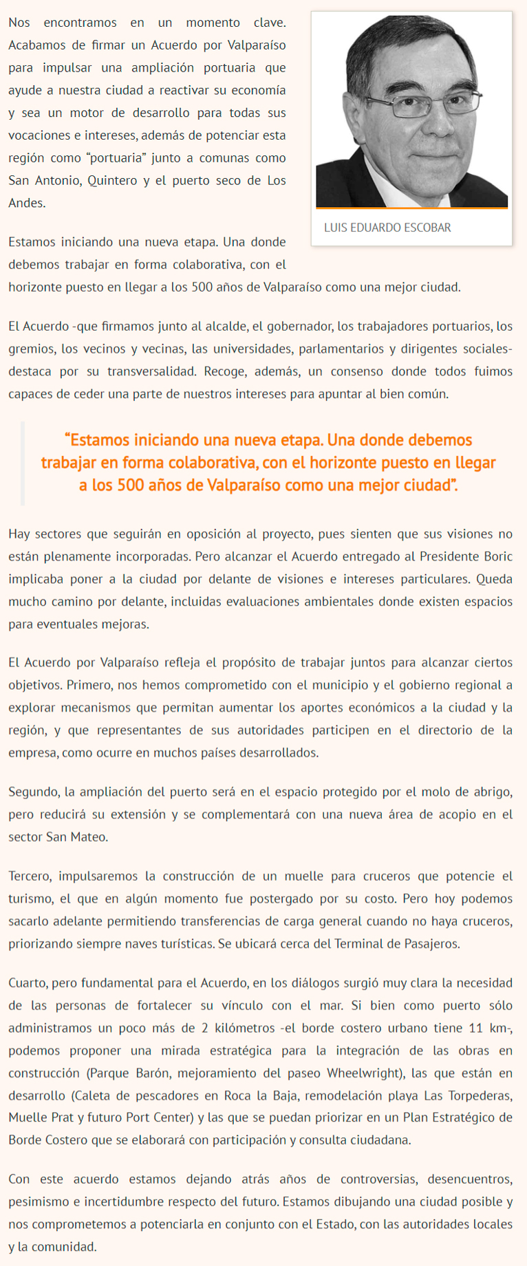 DIARIO FINANCIERO – Estamos iniciando una nueva etapa. Una donde debemos trabajar en forma colaborativa, con el horizonte puesto en llegar a los 500 años de Valparaíso como una mejor ciudad.
