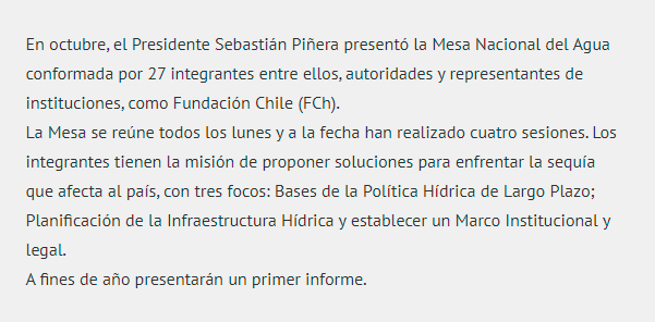 -Es un trabajo de dos años en el marco de Escenarios Hídricos. Estamos empezando y esperamos tener algunos avances intermedios a los seis meses y un año. La idea es ponerlo a disposición de la Mesa. El Presidente (Piñera) encomendó a la Mesa un primer informe a fin de año y espero tener claridad de cuál va a ser nuestro aporte ahí.