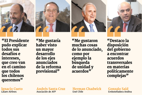 DIARIO FINANCIERO – Estas fueron las cuatro preguntas que DF le hizo a una veintena de hombres de negocios respecto de la primera cuenta pública de Sebastián Piñera el viernes y, a continuación, están sus visiones.