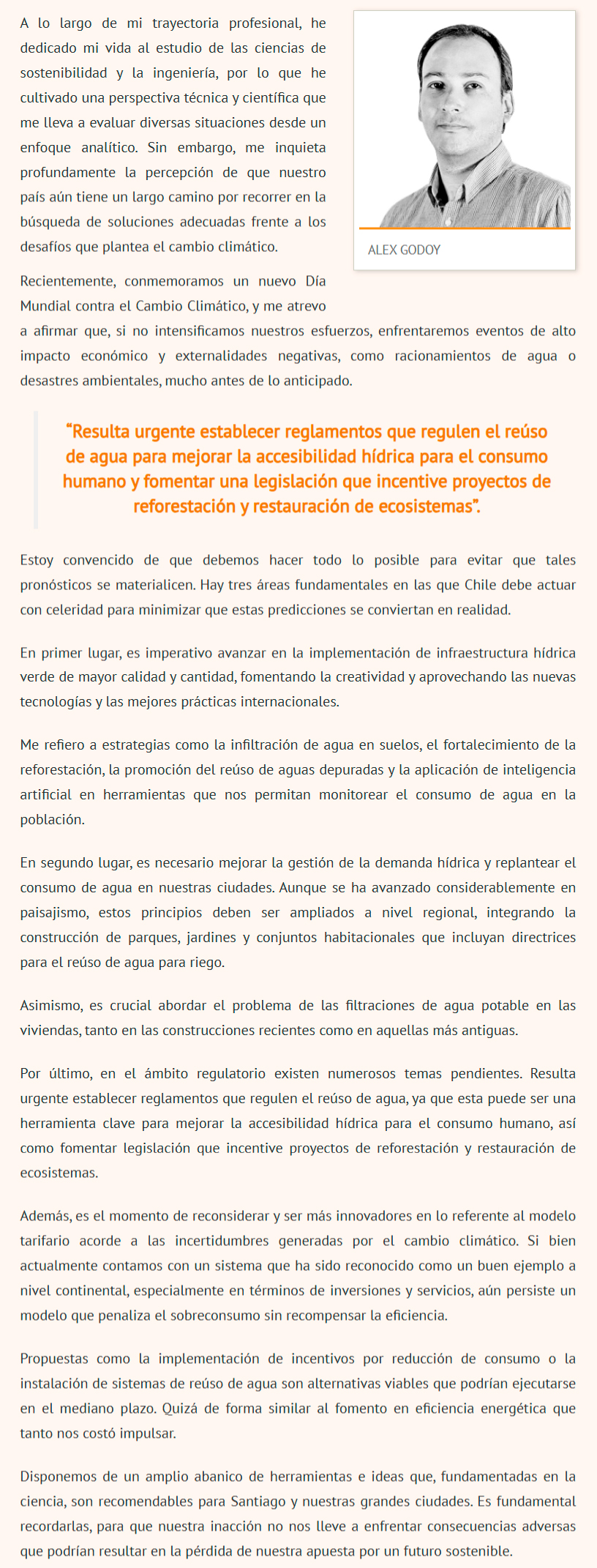 DIARIO FINANCIERO – Implementación de infraestructura hídrica verde de mayor calidad y cantidad; mejorar la gestión de la demanda hídrica y replantear el consumo de agua en nuestras ciudades; abordar los temas pendientes en el ámbito regulatorio, son las áreas fundamentales en las que actuar