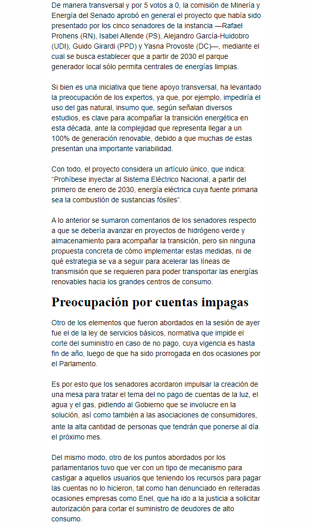 EL MERCURIO – De esta manera, y de terminar promulgándose la moción -apoyada de manera transversal-, se prohibiría también uso de las centrales a gas natural.