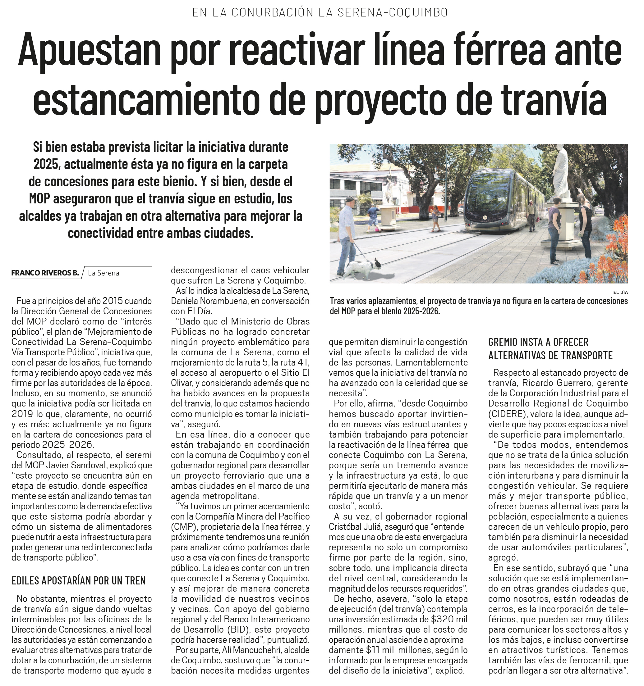 EL DÍA – Si bien estaba prevista licitar la iniciativa durante 2025, actualmente ésta ya no figura en la carpeta de concesiones para este bienio. Y si bien, desde el MOP aseguraron que el tranvía sigue en estudio, los alcaldes ya trabajan en otra alternativa para mejorar la conectividad entre ambas ciudades.