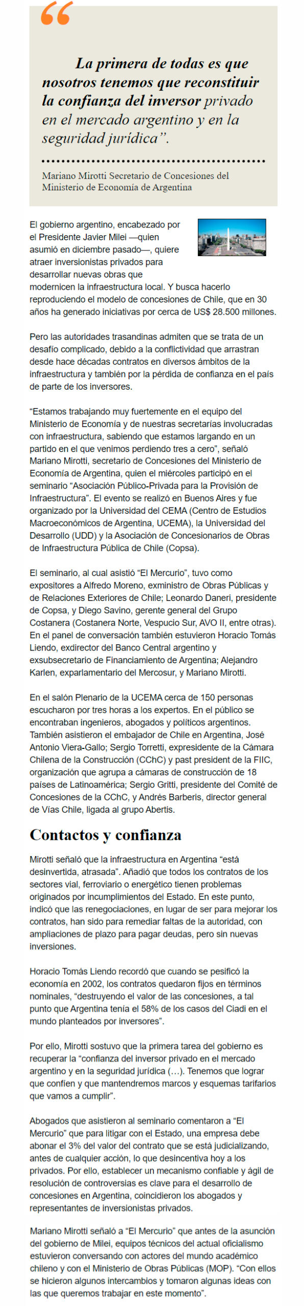 EL MERCURIO – La semana pasada se realizó en Buenos Aires un seminario que contó con la participación de Alfredo Moreno, COPSA y el secretario de Concesiones del Ministerio de Economía de Argentina