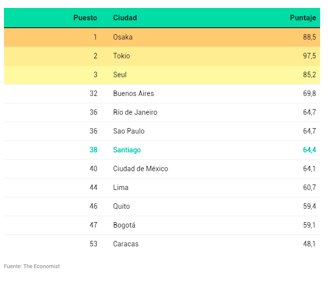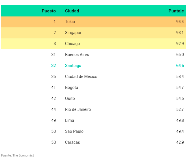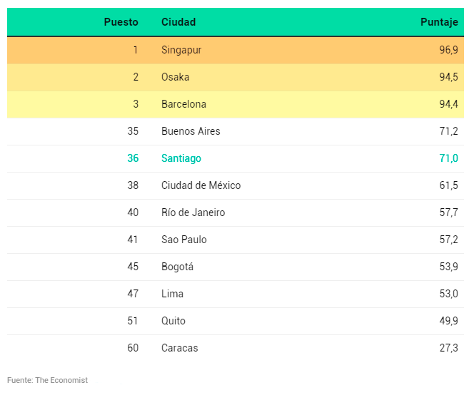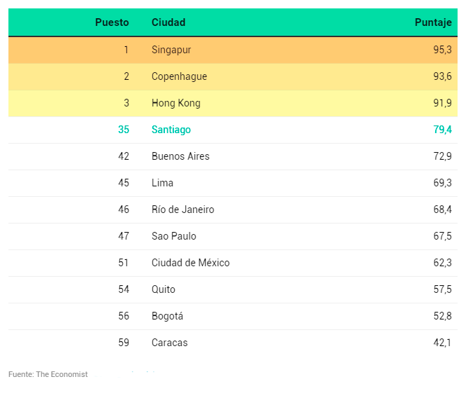 En cuanto a la realidad nacional, Santiago, con 69,8 puntos (en una escala de 0 a 100, donde 100 es la mejor puntuación), está como la número 33 en la lista, y la primera en Latinoamérica.