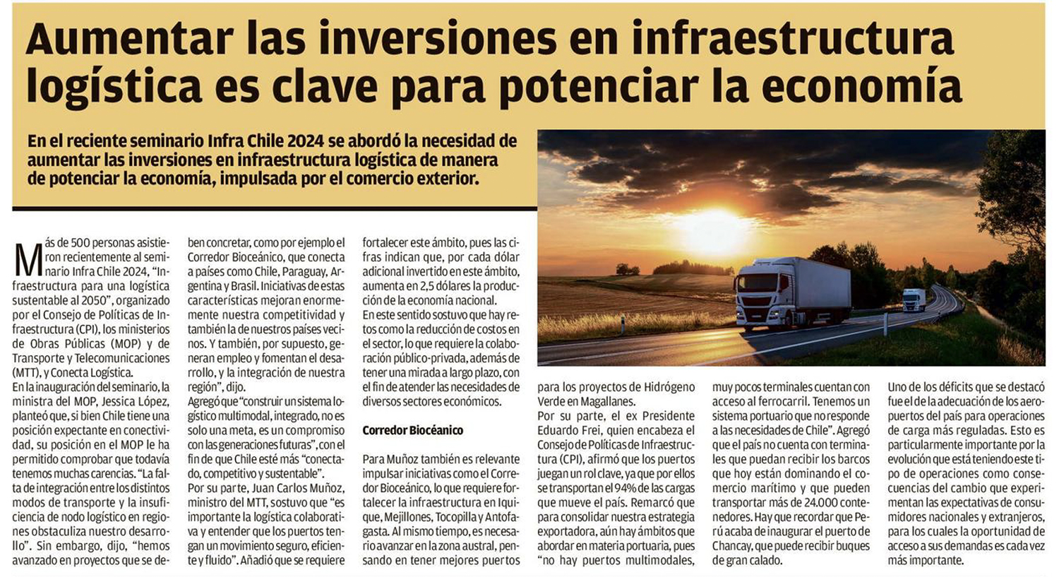 EL MERCURIO DE VALPARAÍSO – En el reciente seminario Infra Chile 2024 se abordó la necesidad de aumentar las inversiones en infraestructura logística de manera de potenciar la economía, impulsada por el comercio exterior.