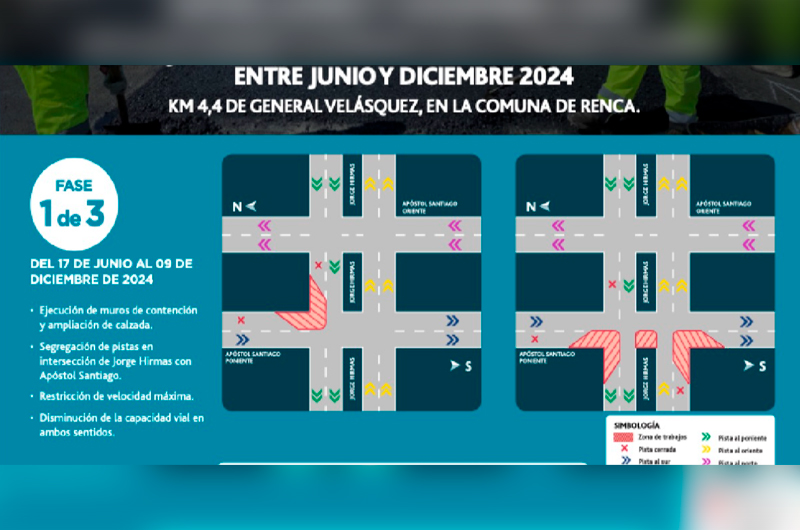 Contempla segregaciones de pista en la Intersección de Jorge Hirmas con Apóstol Santiago, además de la disminución en la capacidad vial en ambos sentidos y restricción de velocidad máxima.