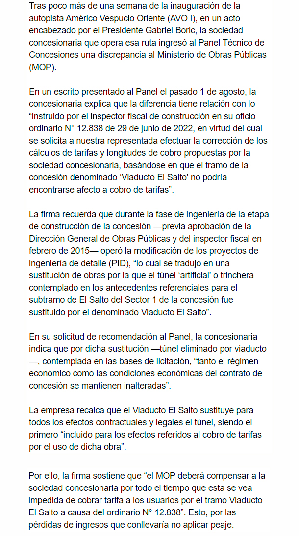 EL MERCURIO – La firma acusa instrucción que impide cobro de tarifas en sector Viaducto El Salto, por lo que solicita al organismo recomendar una compensación del ministerio.