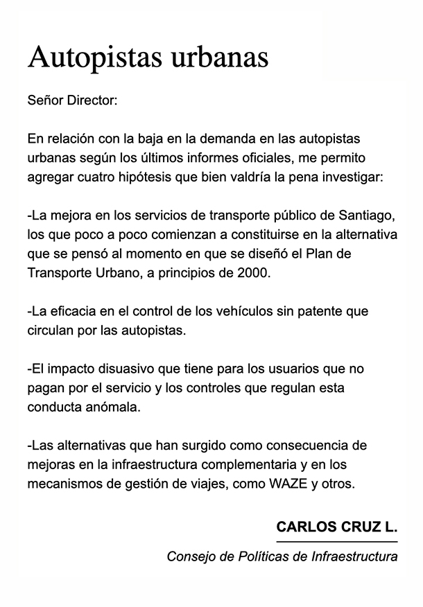 EL MERCURIO – En relación con la baja en la demanda en las autopistas urbanas según los últimos informes oficiales, me permito agregar cuatro hipótesis que bien valdría la pena investigar.