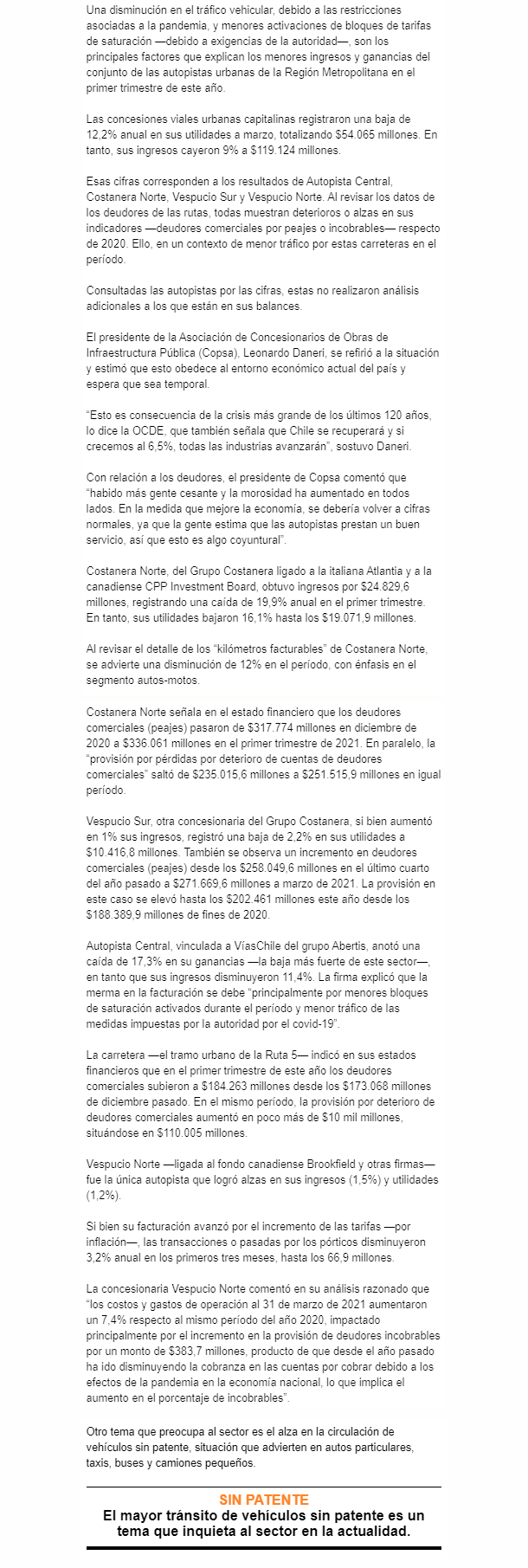 EL MERCURIO – Los ingresos de las carreteras metropolitanas cayeron en 9% en los tres primeros meses del año. El gremio del rubro, Copsa, espera que, junto a una recuperación de la economía, los datos de morosidad mejoren.