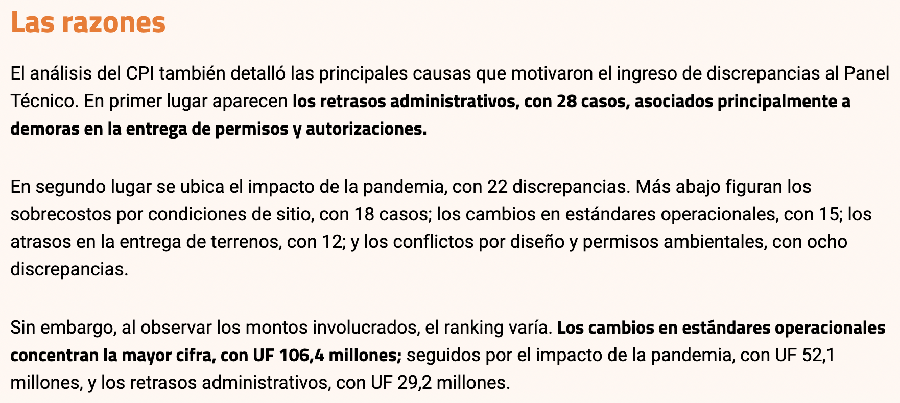 DIARIO FINANCIERO – El análisis del CPI también detalló las principales causas que motivaron el ingreso de discrepancias al Panel Técnico. En primer lugar aparecen los retrasos administrativos, con 28 casos, asociados principalmente a demoras en la entrega de permisos y autorizaciones.