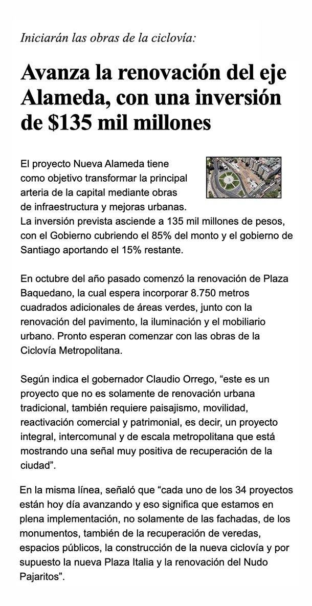 EL MERCURIO – El proyecto Nueva Alameda tiene como objetivo transformar la principal arteria de la capital mediante obras de infraestructura y mejoras urbanas