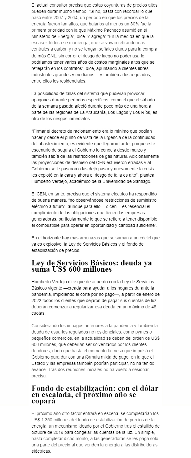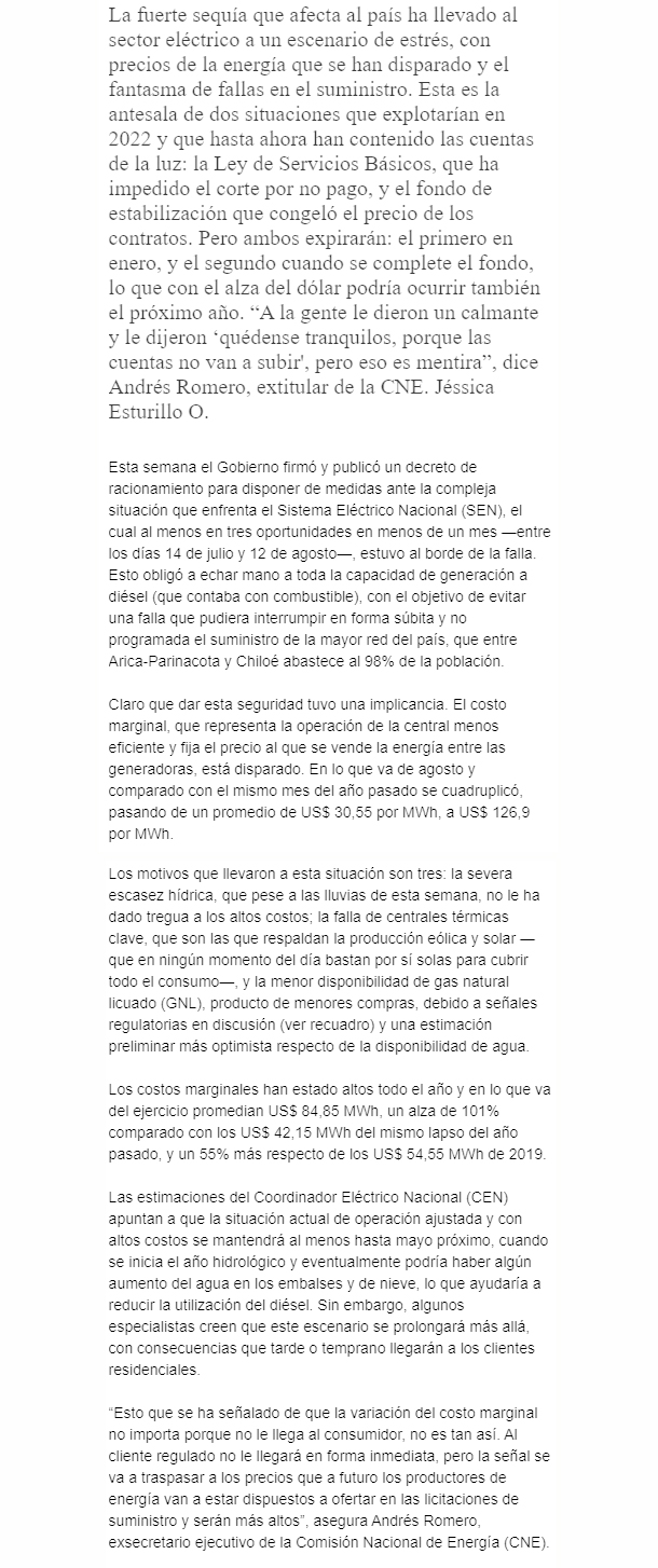 EL MERCURIO – La fuerte sequía que afecta al país ha llevado al sector eléctrico a un escenario de estrés, con precios de la energía que se han disparado y el fantasma de fallas en el suministro.