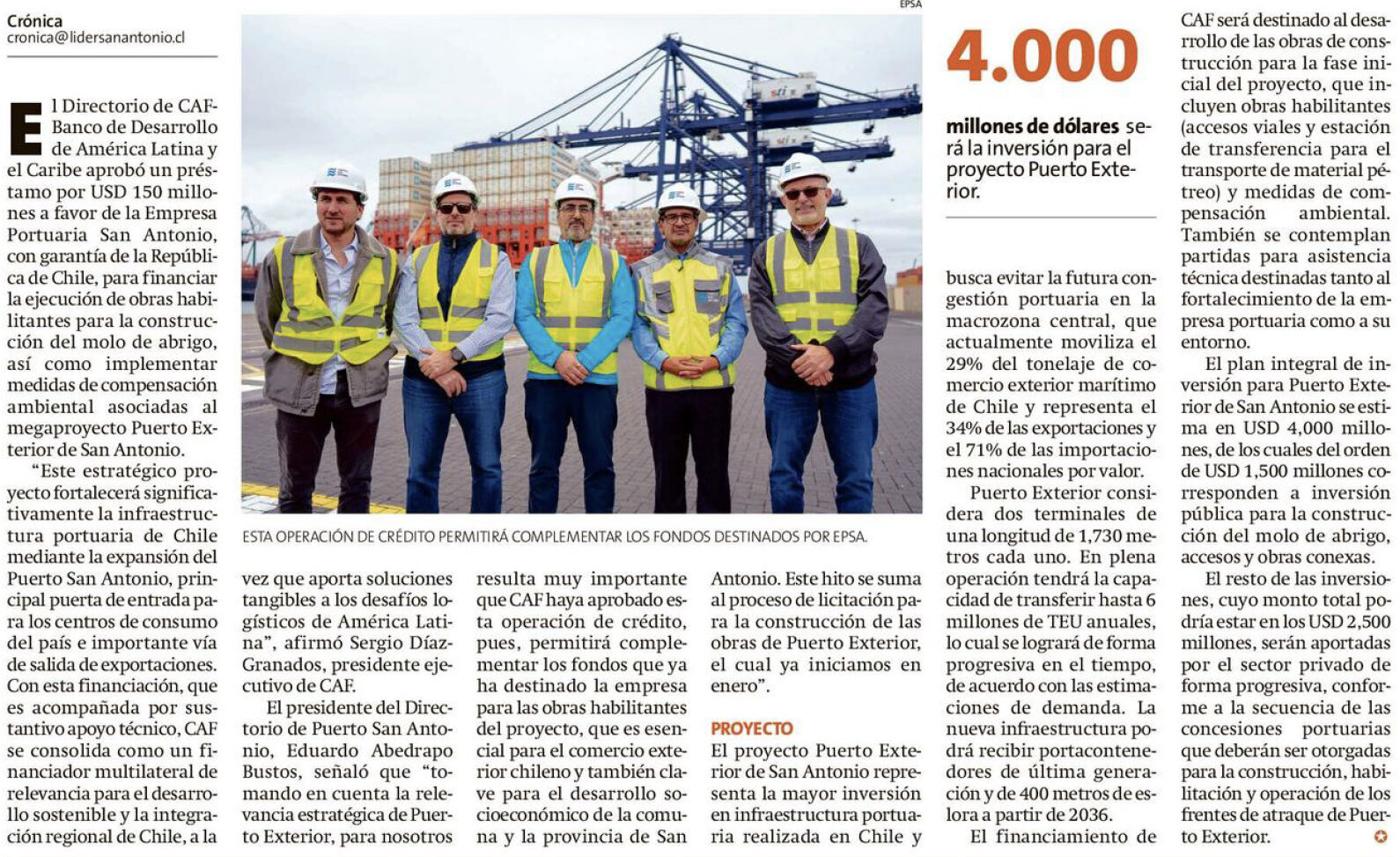 EL LÍDER DE SAN ANTONIO – El préstamo contribuirá al desarrollo logístico e integración de la macrozona central de Chile, aumentando la capacidad de transferencia de carga entre el puerto y los centros de producción y consumo.