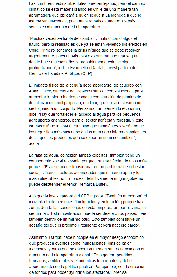 EL MERCURIO – Las cumbres medioambientales parecen lejanas, pero el cambio climático se está materializando en Chile de una manera tan abrumadora que obligará a quien llegue a La Moneda a que lo asuma sin dilaciones, pues nuestro país es uno de los más sensibles al aumento de la temperatura.